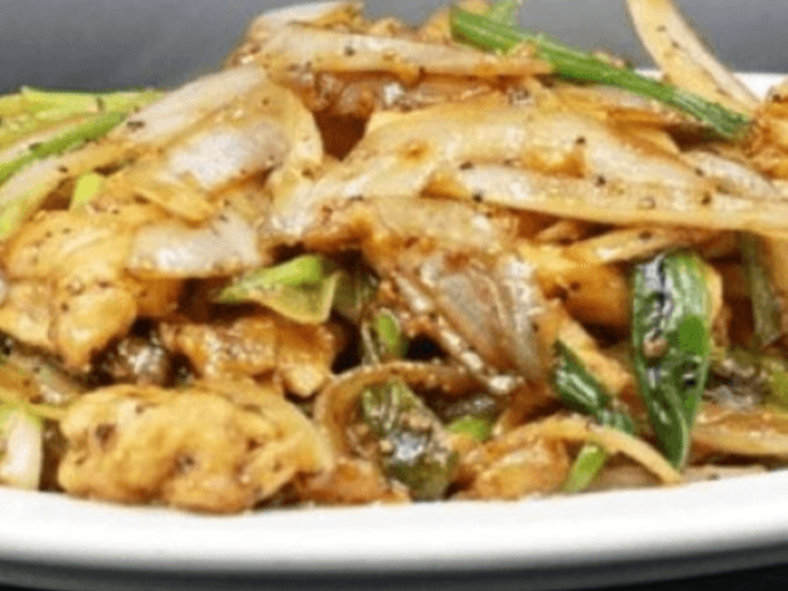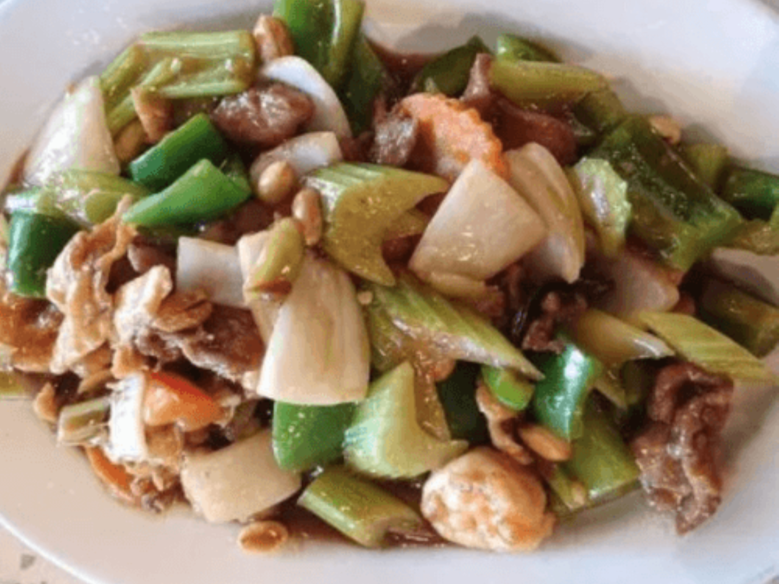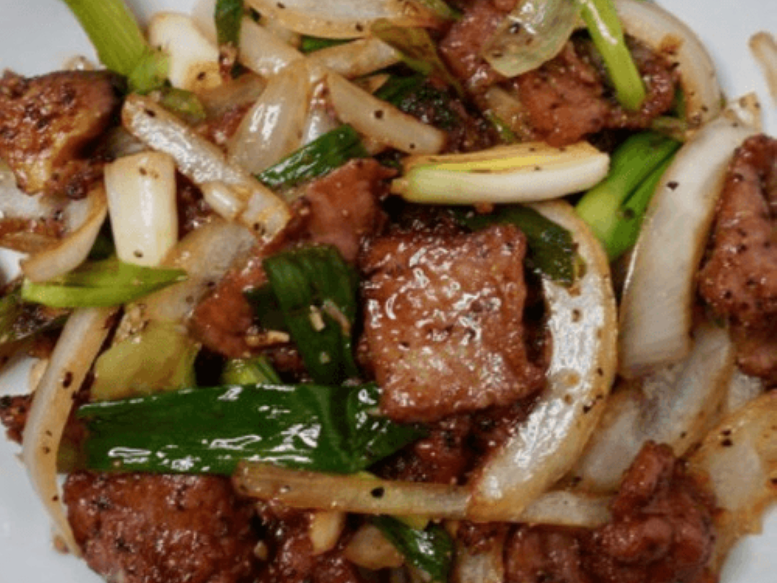 Tender sliced beef with carrots, onion, jalapeno and fresh slices of pineapple tossed in our house garlic ginger brown sauce