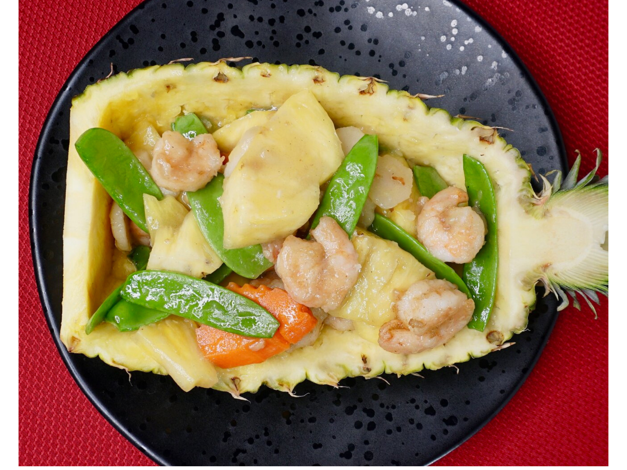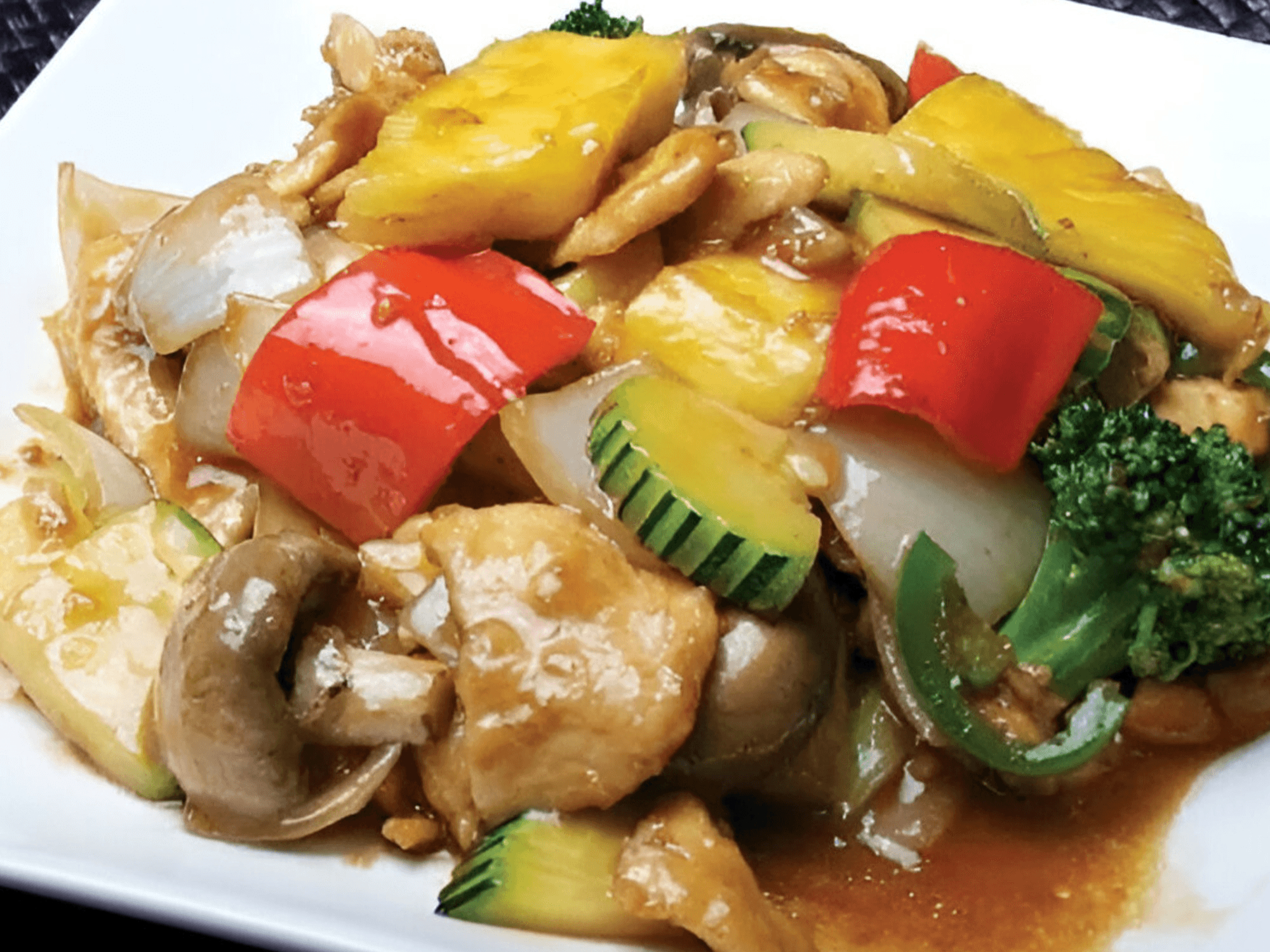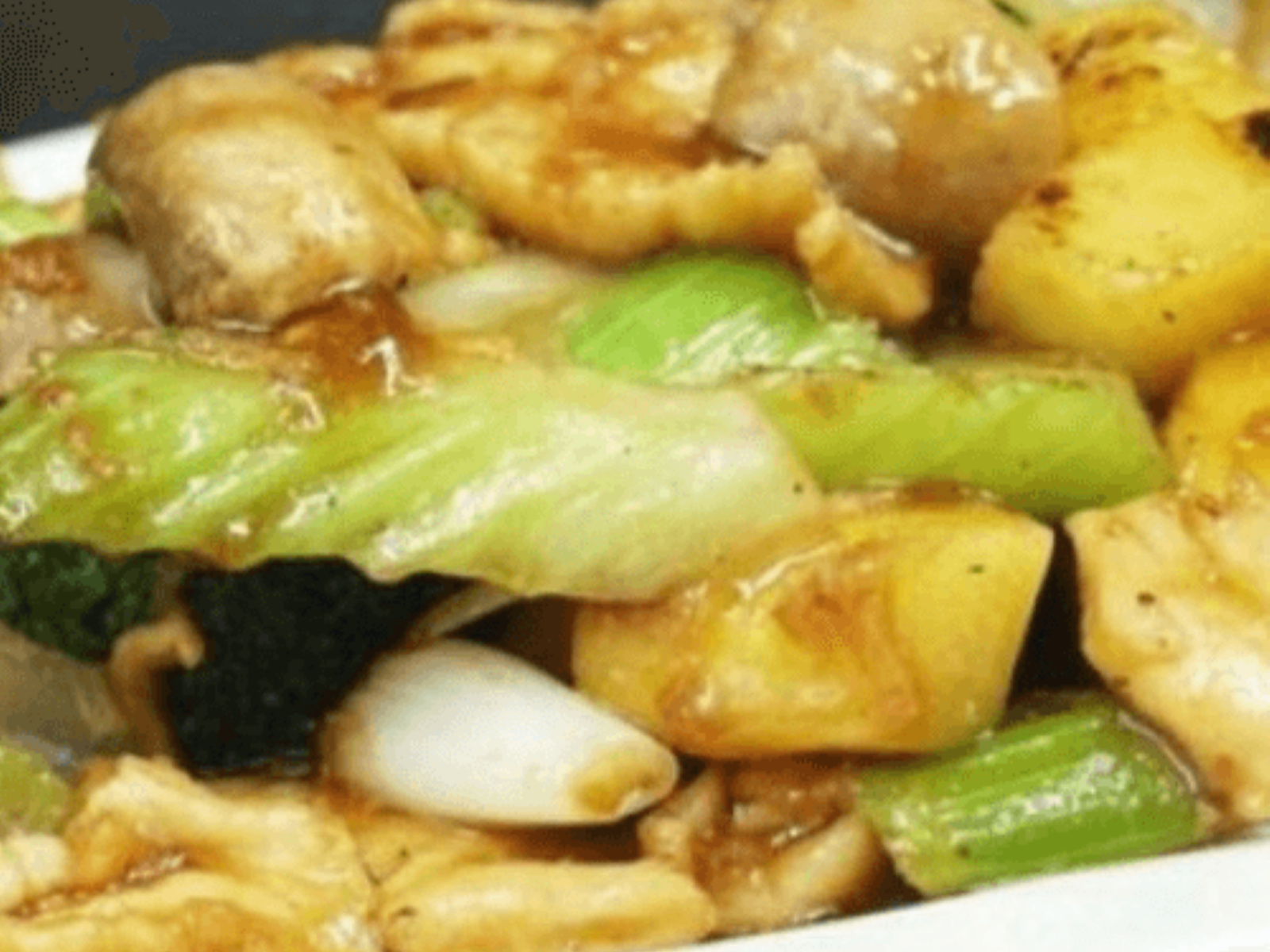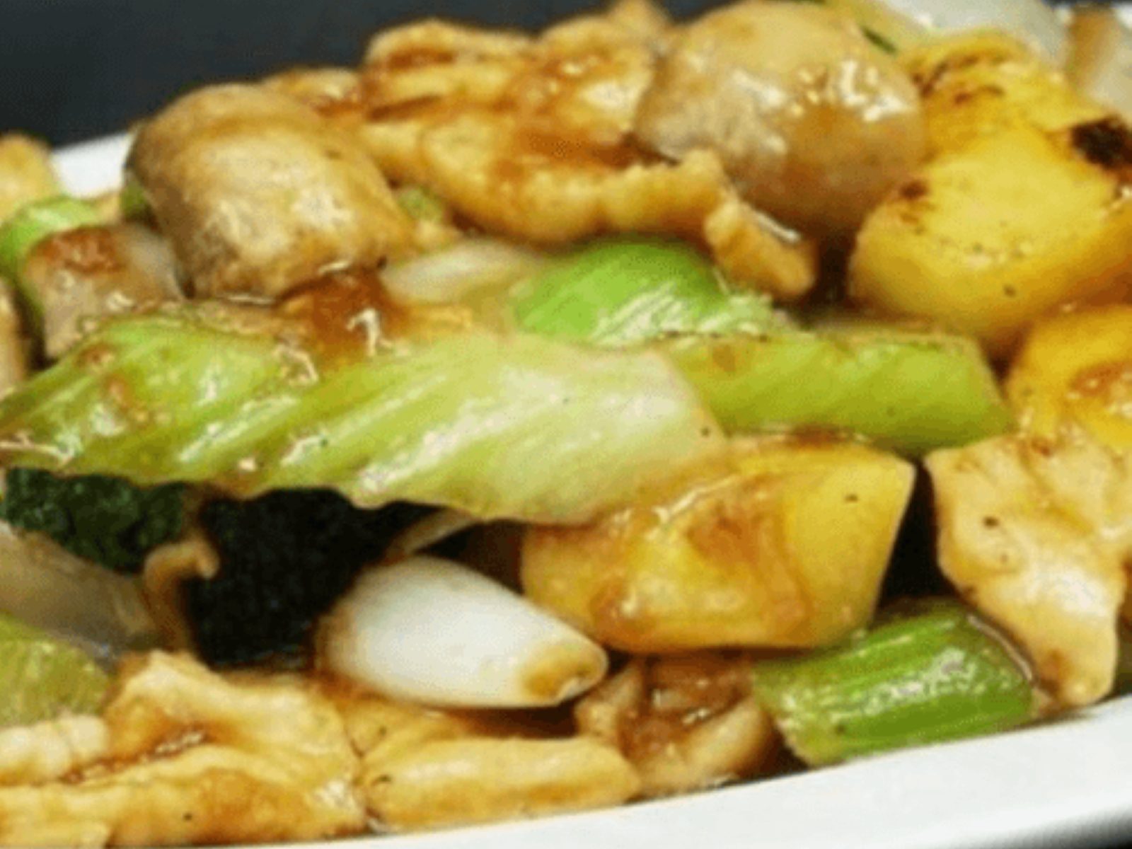 Tender sliced beef with carrots, onion, and fresh slices of pineapple tossed in our house garlic ginger brown sauce